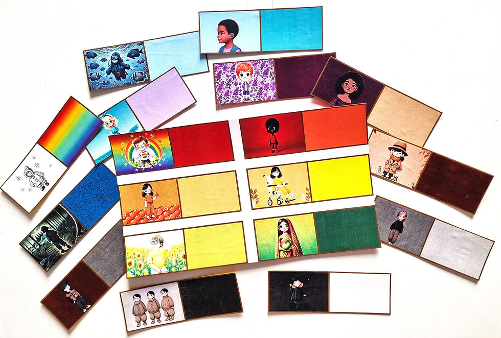 Bei unseren Dominos werden passende Bilder oder Farben aneinandergelegt – ein simples Prinzip mit großem Lerneffekt! Jede*r bekommt eine bestimmte Anzahl an Dominosteinen. Ein Stein wird in die Mitte gelegt, und reihum legen die Spieler*innen passende Steine an. Wer keinen passenden Stein hat, setzt aus. Gewonnen hat, wer zuerst alle seine Steine abgelegt hat!